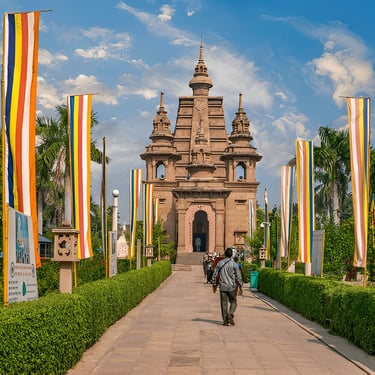 A modern Buddhist temple built by the Mahabodhi Society, featuring beautiful frescoes and a peaceful garden.